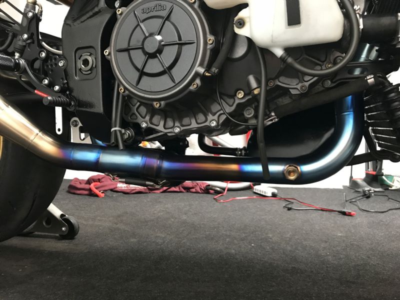 Akrapovic EVO 5 titanium system with the even more unobtainable carbon curved hanger. Ti wideband bungs welded onto headers by MHP (for mapping / TB balancing)