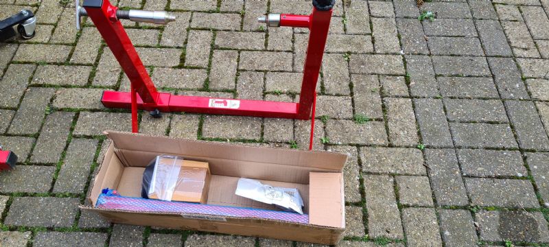 ##SOLD## Abba stand & front lift attachment with RSV Mille 2002 fitting kit. The main stand is used but in good working condition. The front lift attachment is new still in the box with packaging.