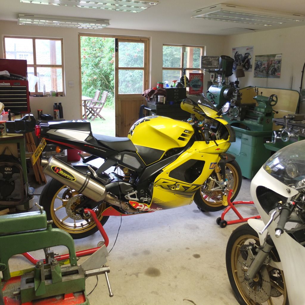 The bike with the white fairing is a series 2 TR750 replica I'm building. Thanks for your comments re shed, spent lots of hours in it. Got the faring off the Aprilia, looks fine with no surprises ..........surprisingly! Going to do all the fluids so suspect will be looking for guidance re clutch and back brake bleeds.