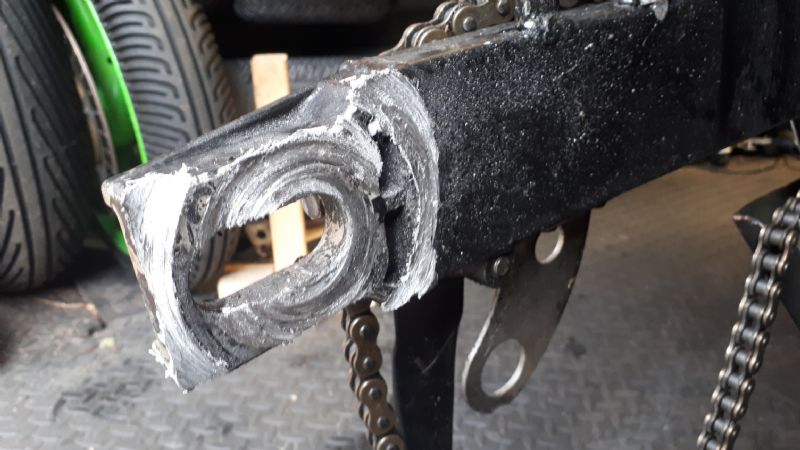 Look at the mess of my swingarm! Sprocket bearing collapsed on the sighting laps at snetterton on Monday evening which obviously allowed the carrier to move which in turn tore the nuts through the swingarm. I was very lucky I was going at sighting pace and also that it was at a cheap evening session at my local circuit and not brands next week.