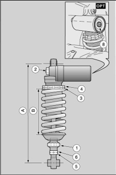 Rear suspension Standard adjustment Shock absorber centre distance (A) 312 ±1.5 mm (12.28 ± 0.59 in) Spring length (preloaded) (B) 145 mm (5.71 in) Rebound adjustment, ring nut (1) from completely closed (*) open (**) 20 clicks Compression adjustment, knob (2) from completely closed (*) open (**) 12 clicks |