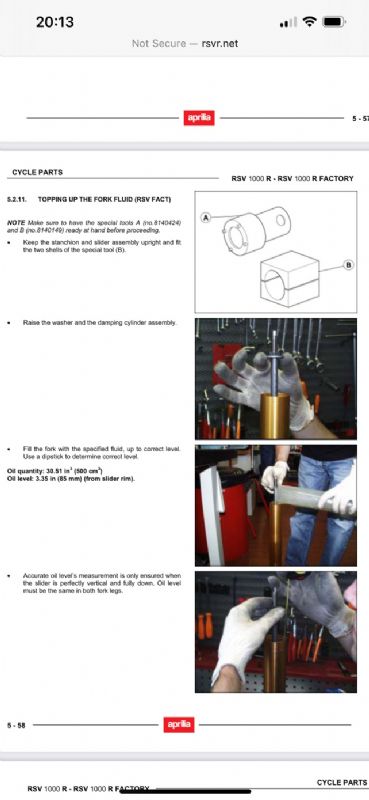 I have a set of 07 RSVR Ohlins in my 04 Tuono. I need to know what the air gap for oil quantity is ? That is, after filling and bleeding, how far from the top of the tube should the oil level be. I have herd 85mm up to 115mm.
