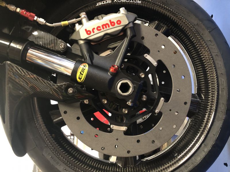 Could be something out of a magazine that picture Warren! Brand new racetechs, brembo M4s, k-tech compression adjuster, quick release dry lines, carbon wheel and carbon mudguard. All framing those trick Sicom discs.