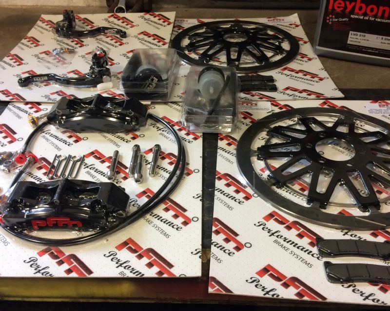 Had mr braking here today aka wal from pfm, he was in the country in stoke on Trent and said he would call in to take a look at the gixxer, you couldn't meet a nicer and more helpful bloke who loves his job. He brought some caliper adapters to try so I can fit radial calipers with 330mm iron discs. Said he's going to send me discs, calipers, lines, brake and clutch mc's with numerous spacers to make it all workπŸ˜ƒ